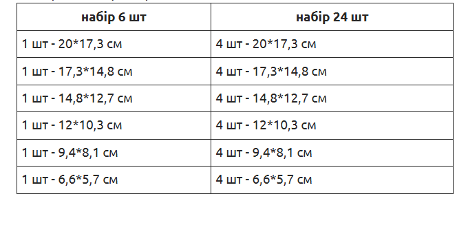 Розмір: 15 см - 2шт, 8 см - 8шт, 5 см - 15шт, 3,5 см - 15 шт, 2 см - 40 шт.